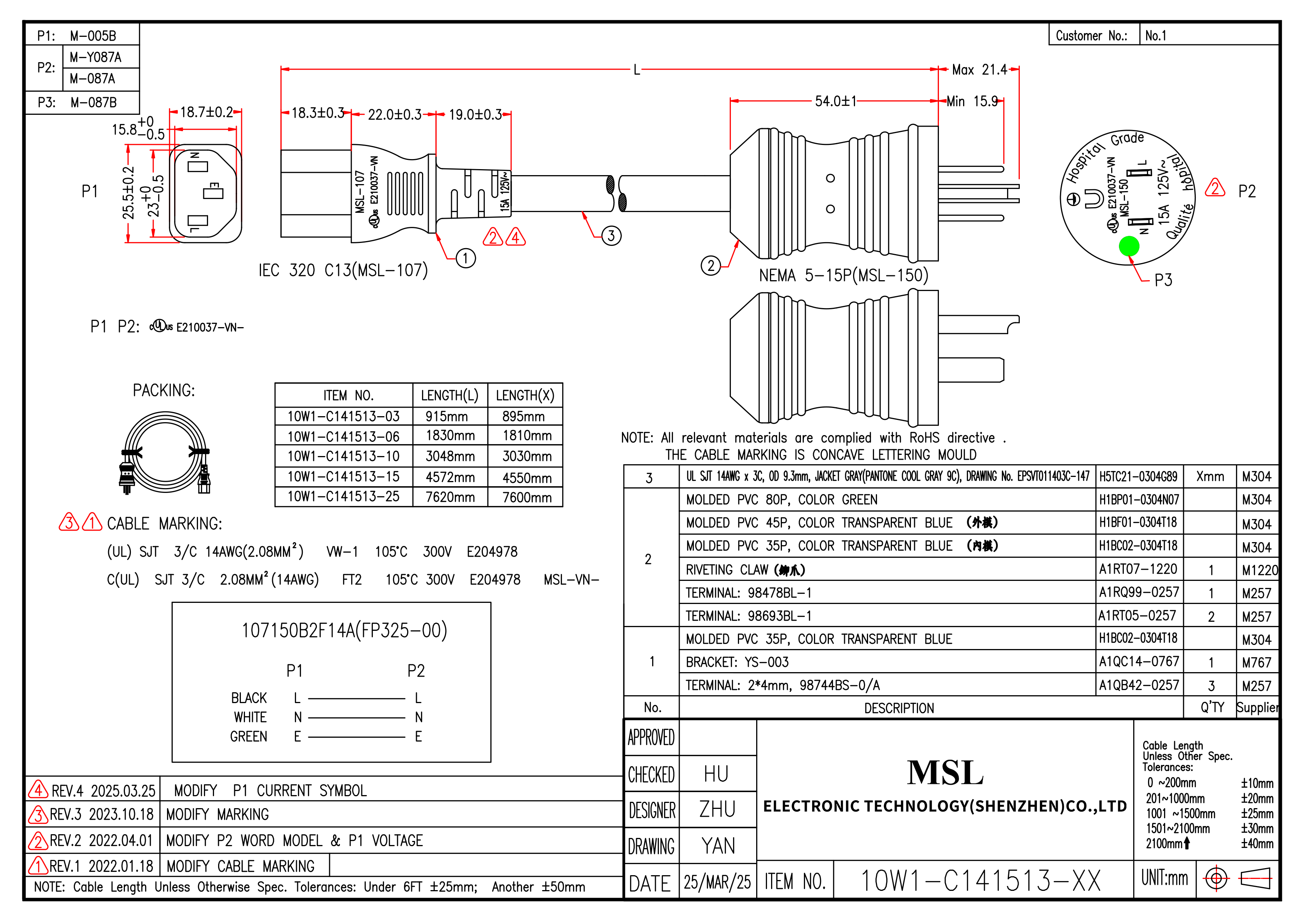 線路號 FP325-00 長度 1FT - 25FT 線材規格 UL SJT 14AWG x 3C, OD 9.3mm, JACKET GRAY(PANTONE COOL GRAY 9C), DRAWING No. EPSVT011403C-147 顏色 黑色、橙色 參考安規 UL
