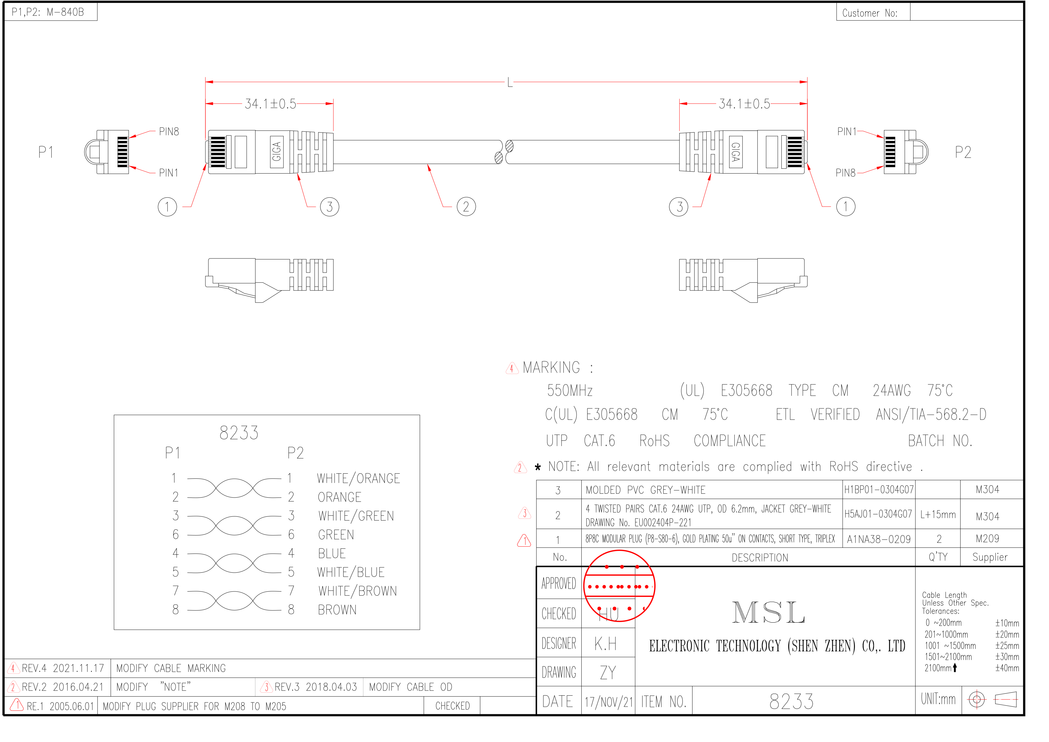 線路號 8233 長度 0.5FT - 200FT 插頭編號 A1NA38-0209 線材規格 UTP CAT.6 #24 4PR OD6.2 (十字架) (EU002404P-221) 顏色 黑色、綠色、灰白色、粉紅色、橙色、棕色 參考安規 UL、CSA、ETL、TIA、EIA 附註 建議長度: 50FT、100FT